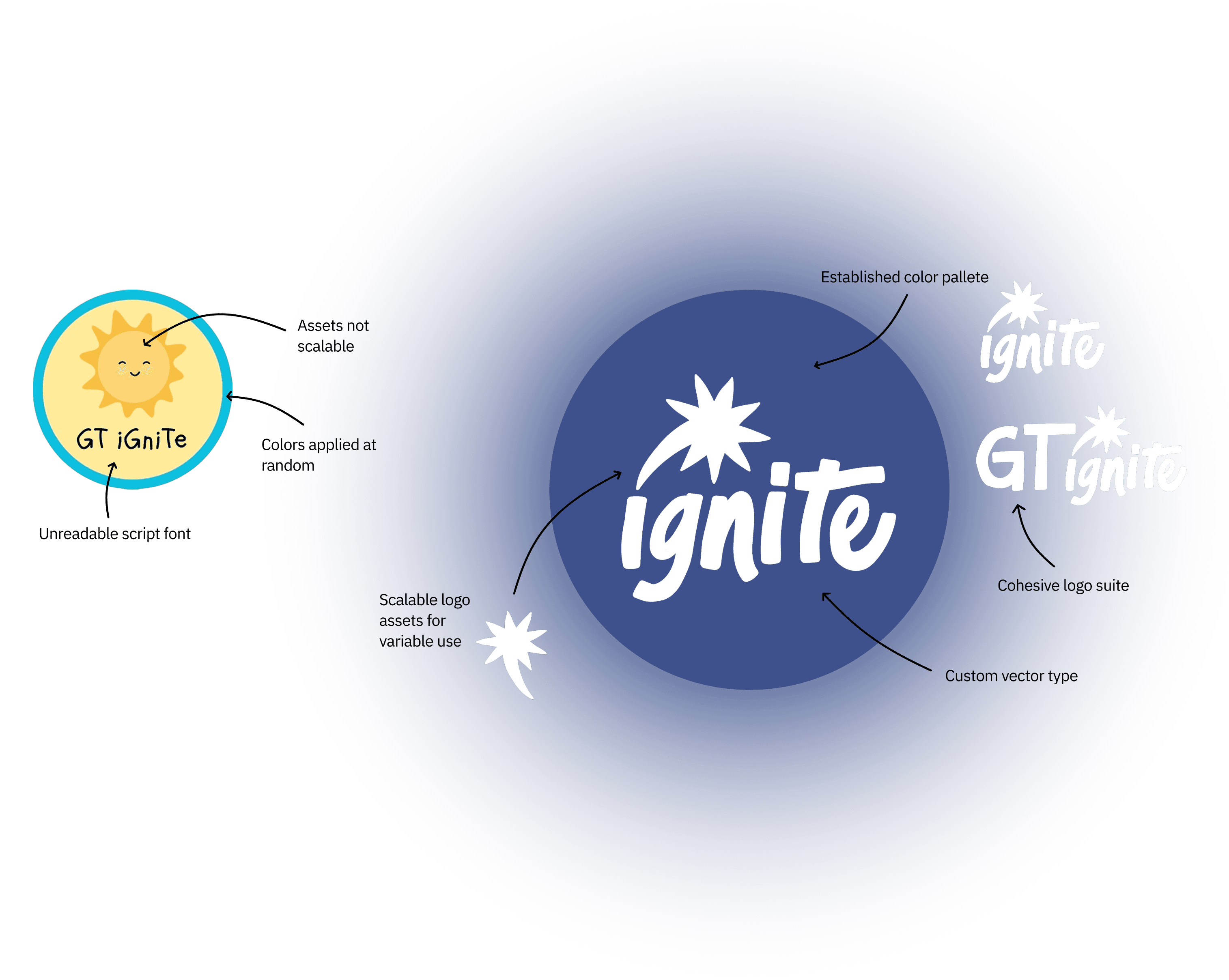 Through multiple iterations and feedback sessions with stakeholders, I refined the brand identity to align with Ignite's mission. Various logo concepts, iconography, and visual elements were tested for clarity and appeal. This phase emphasized adaptability to ensure the brand remained flexible for different platforms and marketing needs.