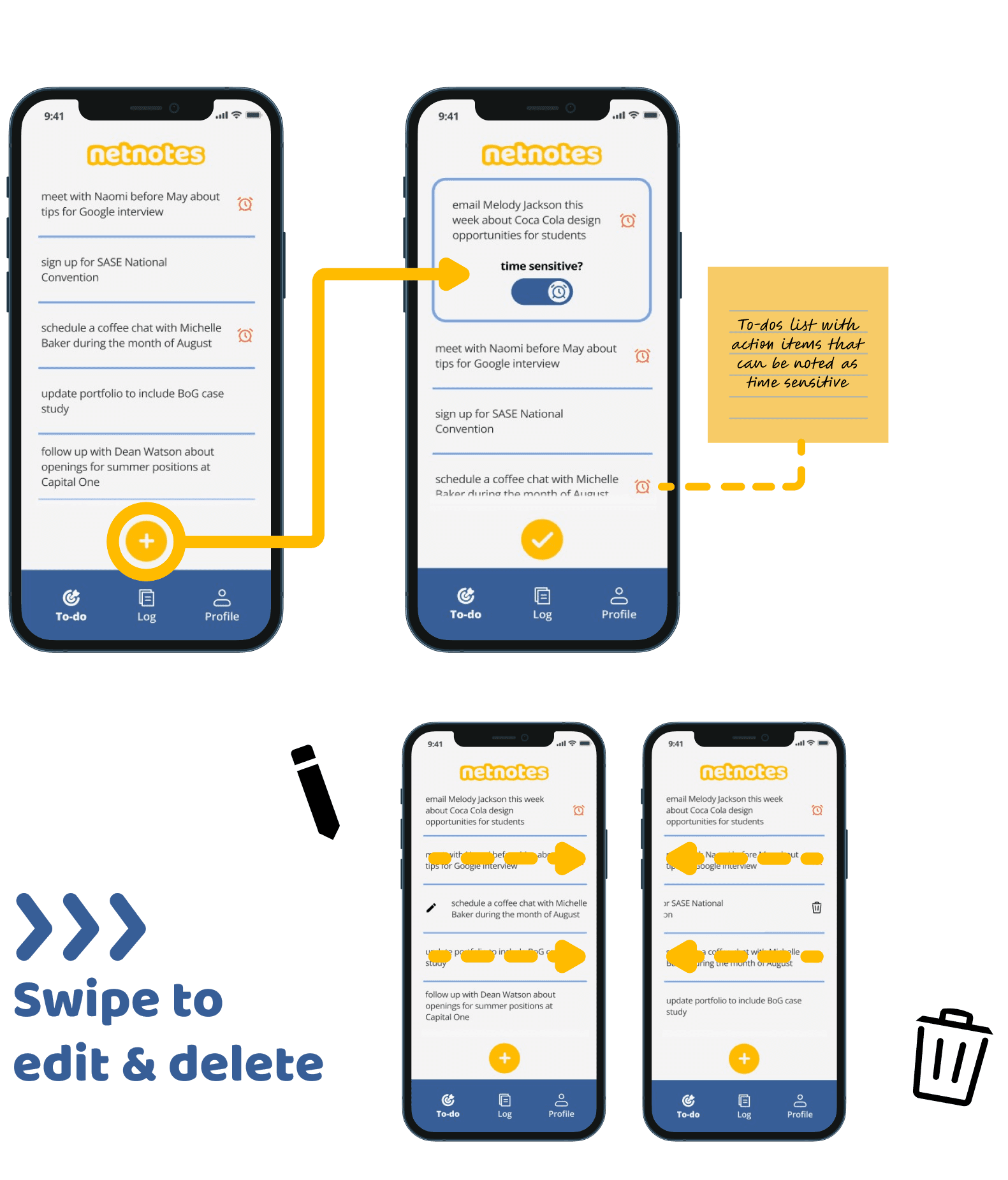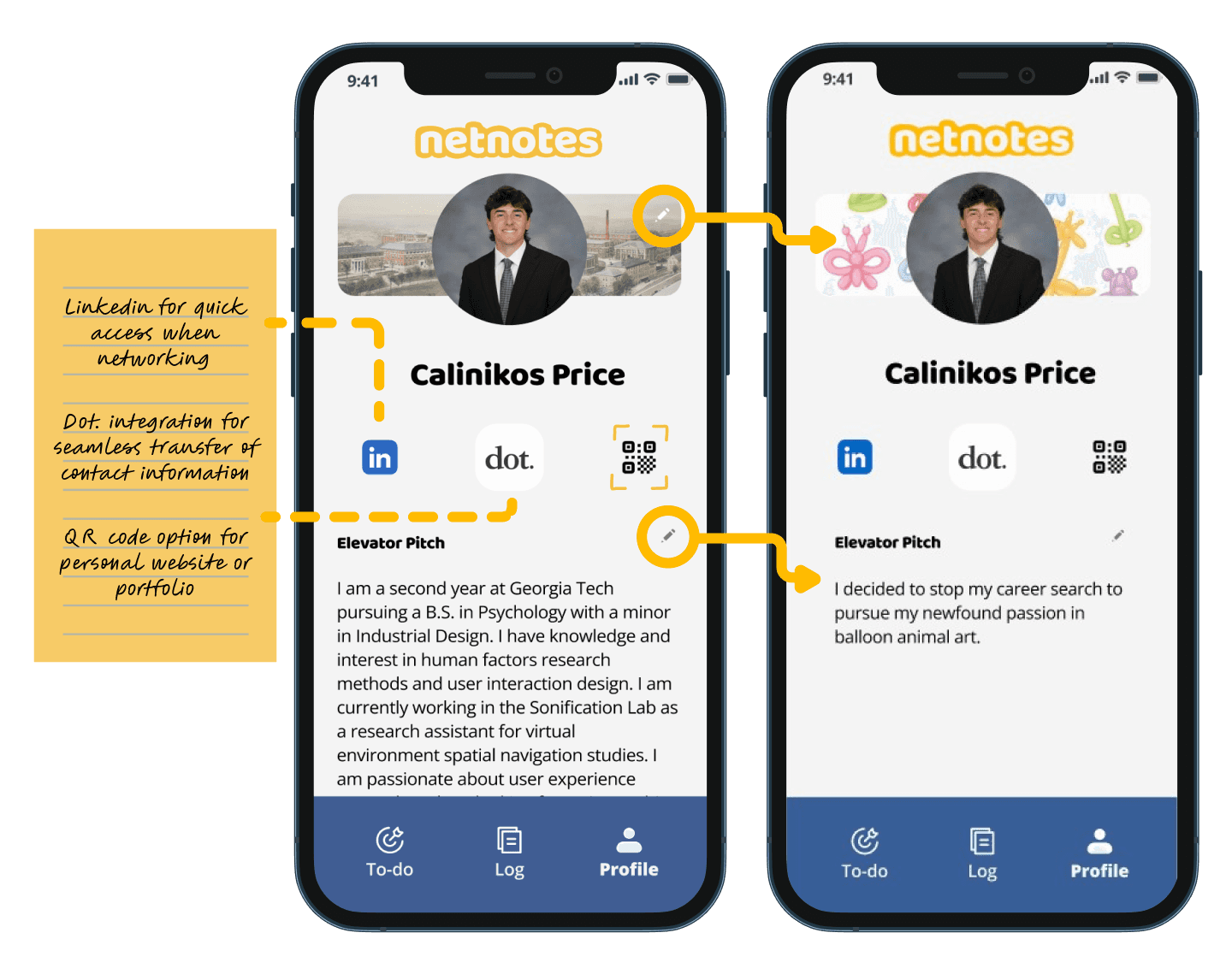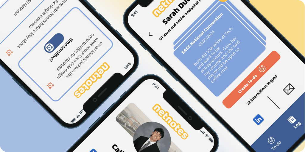 This project dives into the creation for the mobile app Netnotes, a personal networking buddy for students. Through three months of research, design, and testing, we developed a prototyped app design to aid students in one of the most important skills they will learn in college: networking! Netnotes makes this experience more intuitive with automated reminders, note-taking, and an information storing profile.