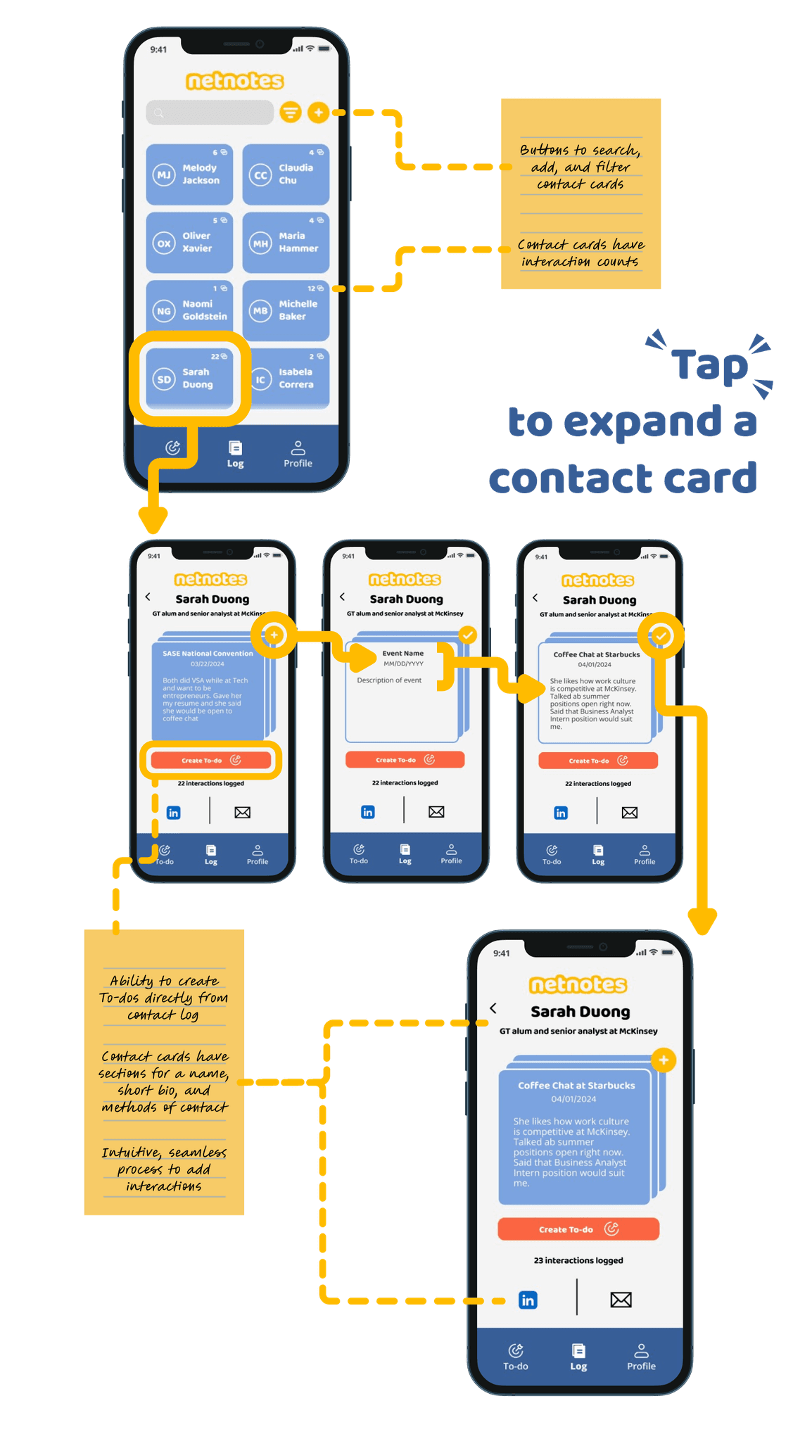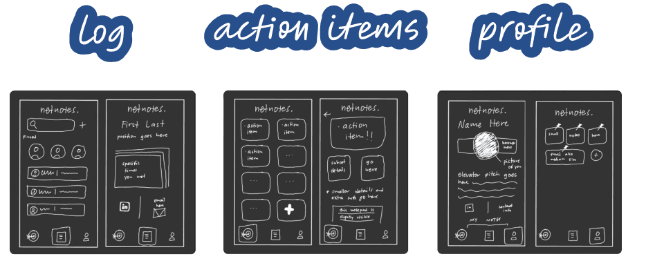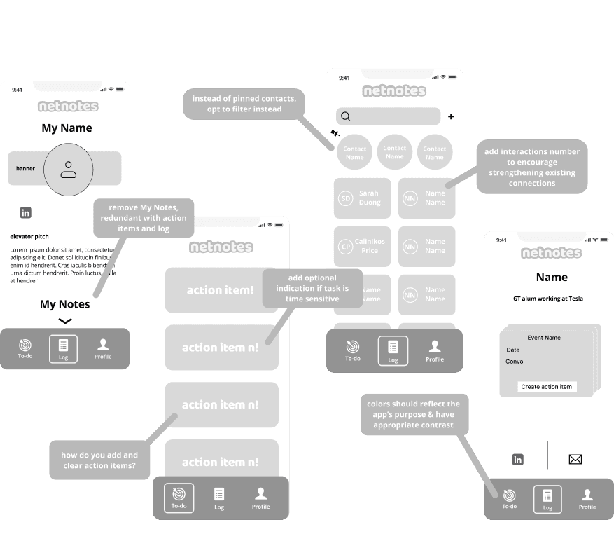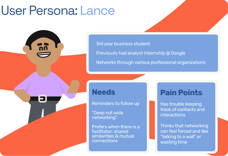 Using interview data, we developed a primary persona named Lance, a business student who values meaningful connections but struggles to keep track of them. We designed low-fidelity wireframes around his needs, prioritizing quick access to follow-ups, interaction logs, and contact-based to-dos.