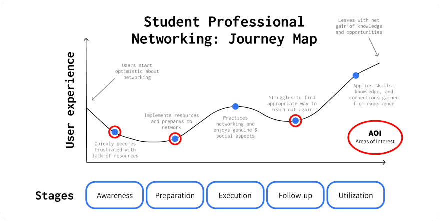 To better understand the student networking experience, I conducted early needfinding through informal conversations with peers and reflection on common struggles. This led to identifying a core gap: students lacked an intuitive system for tracking interactions and felt unsure about when and how to follow up. These insights shaped our initial design goals.
