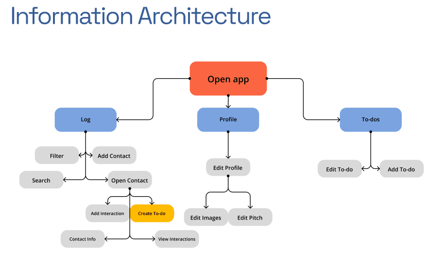 We mapped out the networking journey from preparation to execution and follow-up, revealing key drop-off points where students lose momentum, especially during re-engagement. Using these insights, we constructed an information architecture that made interaction tracking, reminders, and contact management as frictionless and encouraging as possible.
