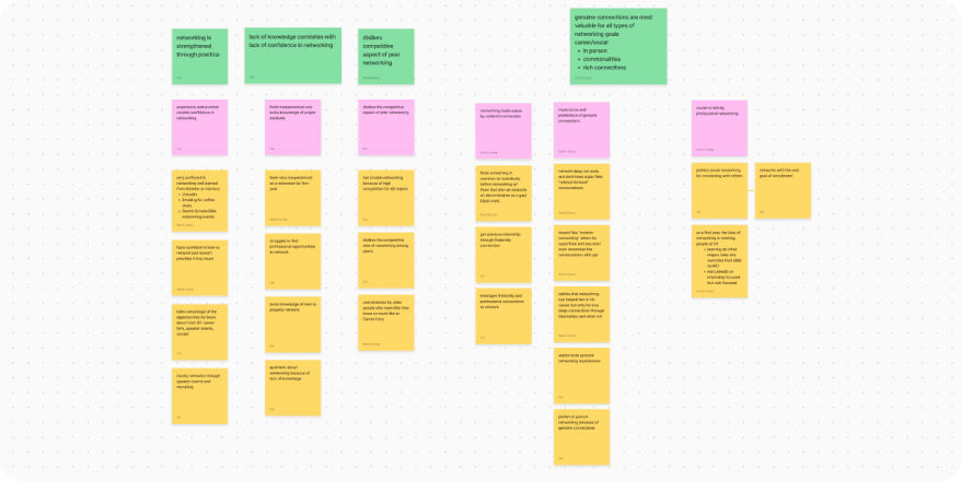 We conducted 7 semi-structured interviews with students of varying experience levels to uncover the pain points of digital networking. Through affinity mapping, we found that students struggled most with retaining connections, lacked confidence, and preferred deeper connections over wide-reaching networks. These findings guided the app’s core features.